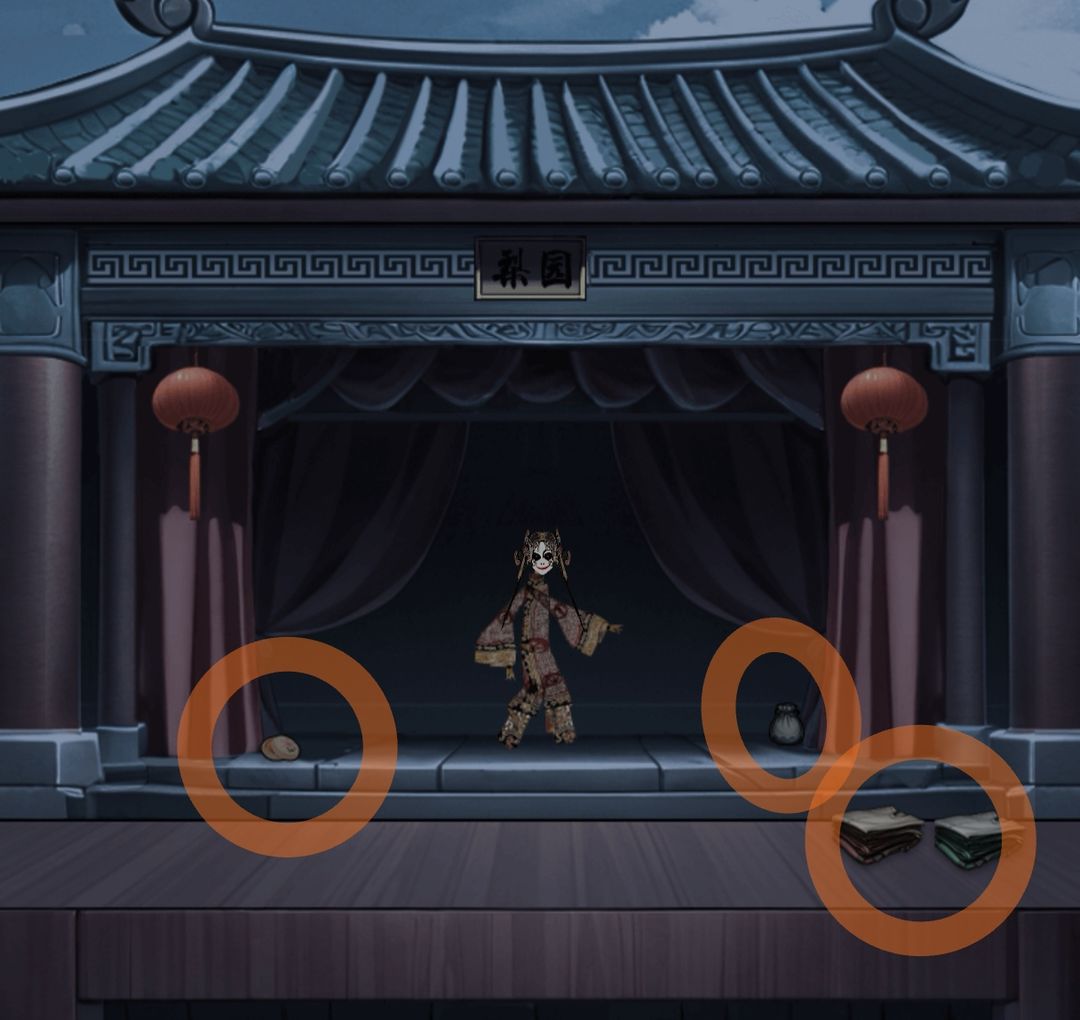走右面(前面有小高能突脸注意!),拿取戏台左右的物品,茶包和胭脂,台子上还有红绿两种颜色的戏服