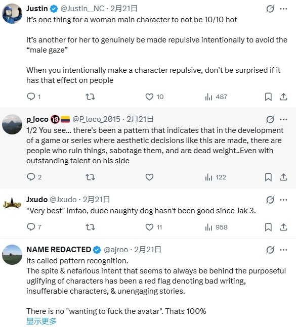 评论区有网友质疑欧美游戏厂商:“为什么他们总设计出外形并不美观的女角?我不是要求每个女角都是超模,但也不应该显得丑陋。日本开发者制作的女角至少赏心悦目,且气场强大。”“女角不漂亮是一回事,但若为了避开男性目光而刻意塑造出令人反感的形象,那就另当别论了。”“那些故意把角色设计得丑陋不堪的行为背后,总隐藏着恶意与不良企图,这是糟糕的写作手法、令人难以忍受的角色以及无趣故事的典型表现。”