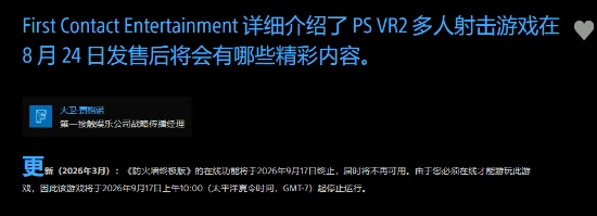 更新内容显示:“《防火墙终极版》的在线功能将于2026年9月17日终止,不再可用。”同时还提醒玩家:“由于本作必须联网才能游玩,从2026年9月17日太平洋时间上午10点起,游戏将无法继续运行。”
