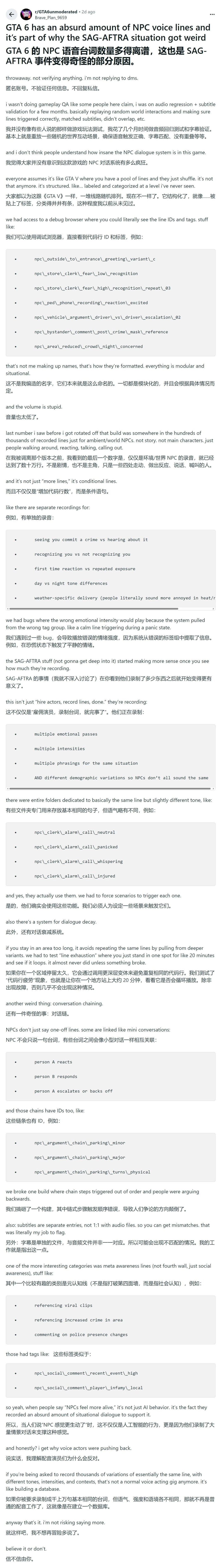 据这位爆料者描述,本作中NPC的对话系统远超《GTA5》的简单循环模式,而是采用了高度结构化的设计。“大家以为还像《GTA5》那样,有一堆台词随机播放。但这次完全不同,”他写道,“对话被标记和分类,其精细程度是我从未见过的。”