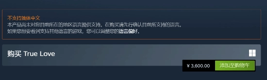 “游戏名叫做《真爱》。这款游戏让我知道了大陆的支付宝无法一次性支付超过3000元来购买游戏,会显示“超过跨境金额上限”。为了购买这款游戏,我把我的Steam账户切换为了港区,拿香港的卡进行了支付,港区的售价是3905港币,比3600人民币还要贵一些。还要忍受3个月的港区高价区。