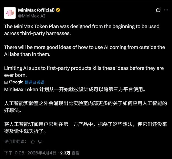 那就让国产的AI大模型给他们来点压力,最近风头正劲的MiniMax今晚也在X上回应了这件事,他们说得倒是挺委婉,表示“将人工智能订阅用户限制在第一方产品中,扼杀了这些想法,使它们还没来得及诞生就夭折了。”