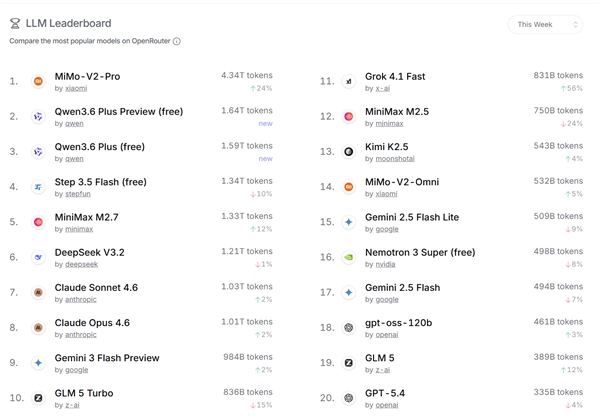 实际上,在OpenClaw风靡全球的这段时间里,几家国产AI大模型的使用量也在飞速增长。近两个多月来,它们长期占据OpenRouter用量榜的前列,其中MiniMax 2.5/2.7曾一度位居榜首,截至目前,其调用量仍保持在TOP5的位置。