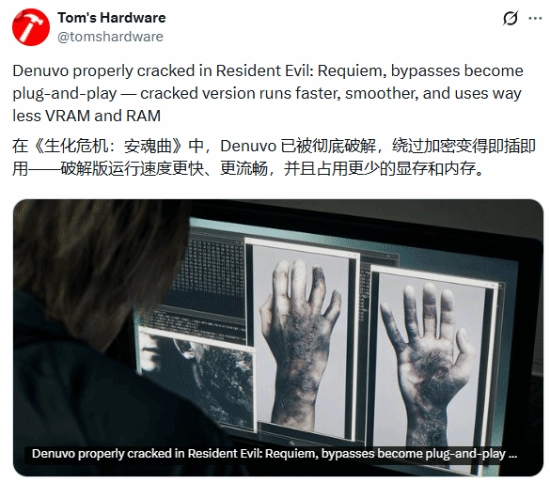 根据Tom's Hardware的相关报道,《生化危机:安魂曲》中的 Denuvo 加密已经被完整,相关绕过程序可以直接使用。对比原版游戏,本运行速度更快,画面更流畅,同时占用的显存和内存也明显更少。