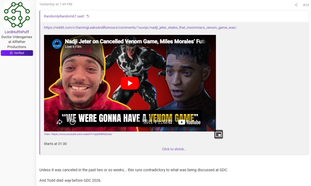该消息一出随即引发各路业内人士众说纷纭,一位游戏开发者在ResetEra论坛表示:“除非游戏在过去两周左右的时间里取消了…… 他的说法与GDC上讨论的内容相矛盾,而且托德逝世的时间远早于GDC 2026”。
