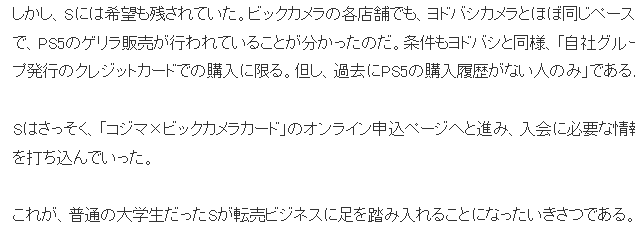 ·实际上S也明白,因为当时商场为了对抗黄牛,规定必须使用会员信用卡购买PS5,而且限额只有10万日元,因此,像S这样的“枪手”还有很多,在S顺利完成任务后,得到了档案袋,里面有刚才购买PS5的价钱和额外多给的1万日元报酬。